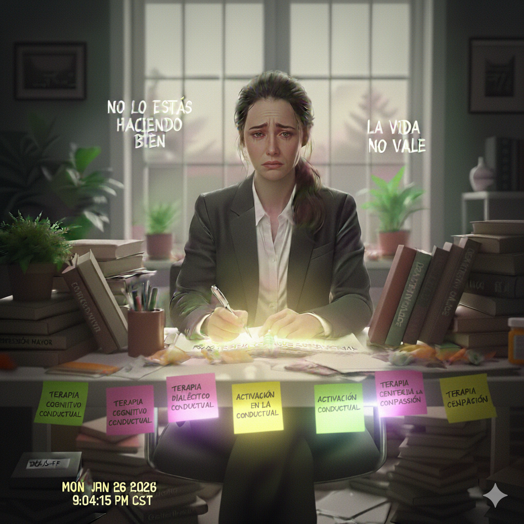 El trastorno depresivo mayor es un trastorno del estado de ánimo definido por criterios diagnósticos específicos establecidos en el DSM-5-TR (American Psychiatric Association, 2022). Este artículo describe su conceptualización desde la psicoterapia basada en evidencia, sus bases neuropsicológicas y neuroquímicas, así como los procedimientos de evaluación clínica mediante instrumentos psicométricos y entrevista clínica. Además, se presentan los principales modelos de intervención psicológica —Terapia Cognitivo Conductual, Activación Conductual, Terapia Dialéctico Conductual, Terapia de Aceptación y Compromiso, terapias centradas en procesos y terapia centrada en la compasión— junto con el abordaje psiquiátrico. Se propone una visión integradora que articula procesos psicológicos, conducta y neurobiología para orientar la formulación clínica y el tratamiento.